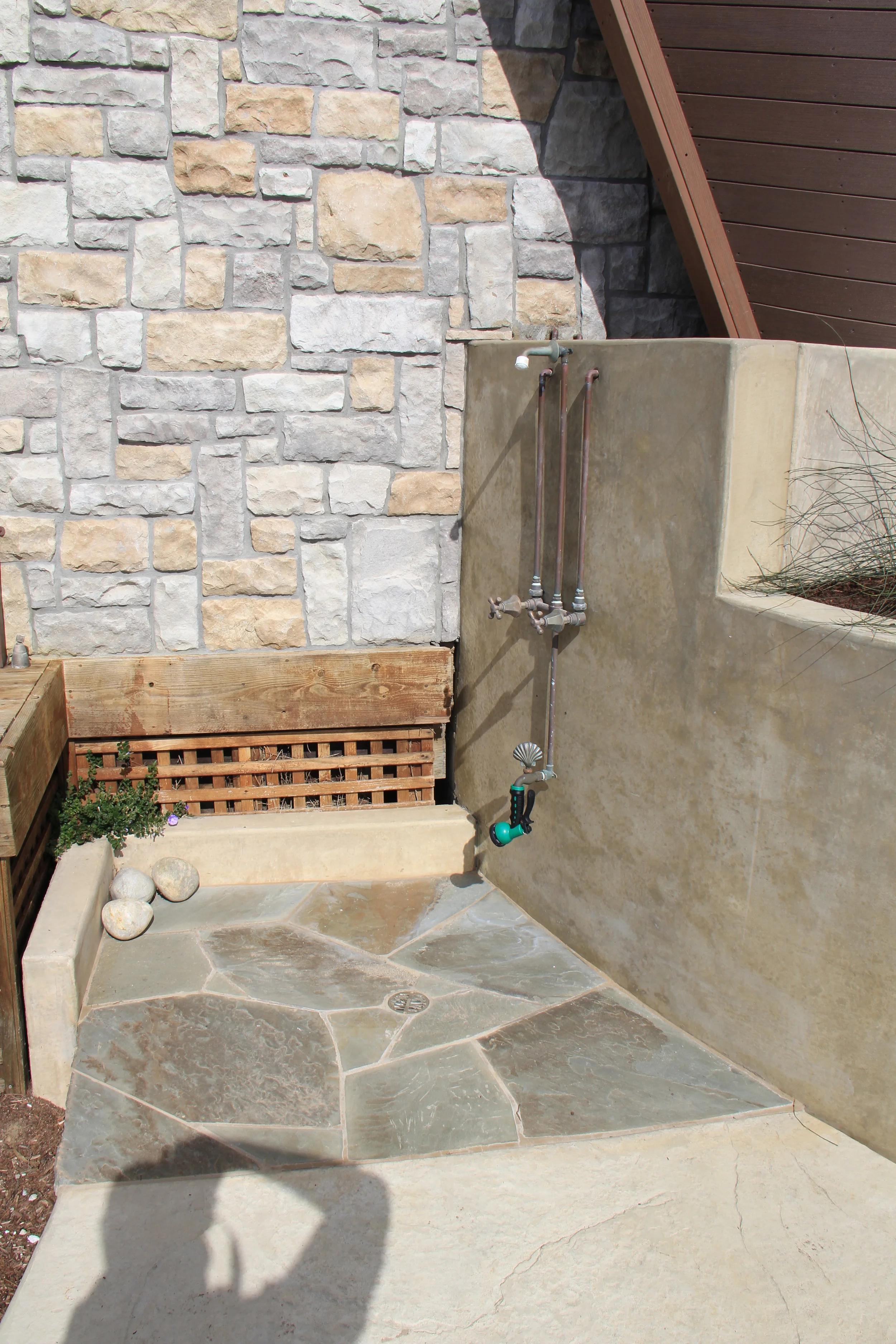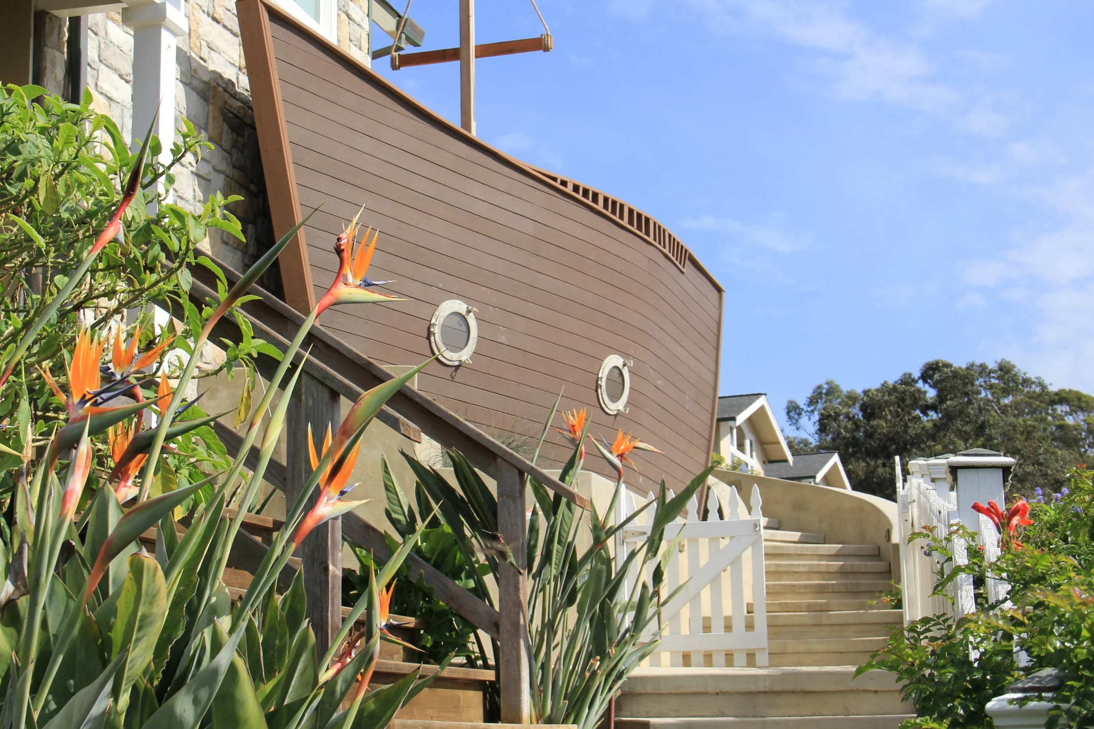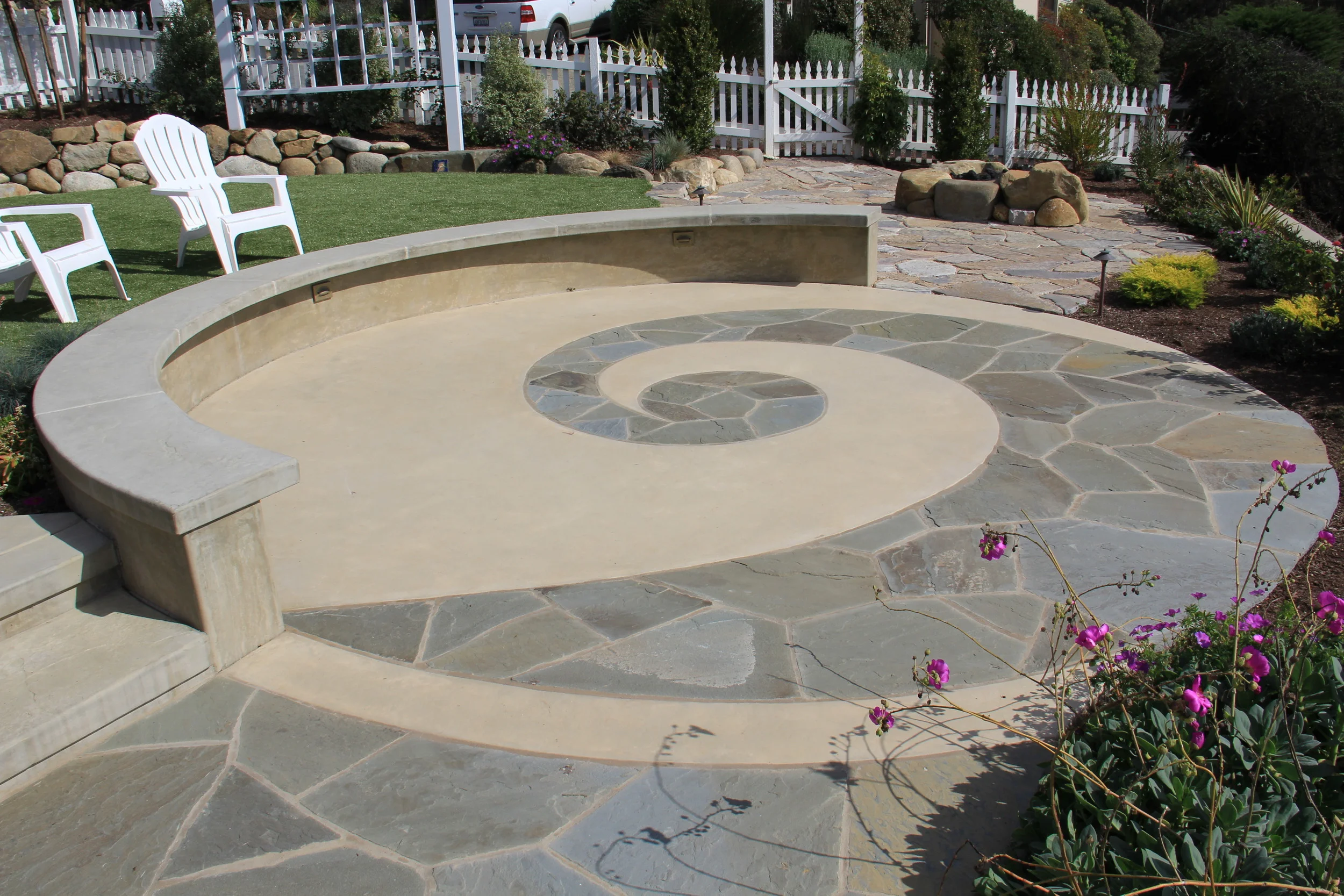This entry garden overlooking the Monterey Bay creates a whimsical space for entertaining and a fun-filled play scape for children. Replacing an old deck and a large, non-functioning pond, the new turf area, flagstone patio and walkway provide a safe and inviting approach to the beach cottage. The seat wall patio and natural fire pit are oriented to focus guests on the panoramic views of Manresa Beach. The new ship’s deck and captain’s wheel wrap around the ocean side of the house create a unique play area for guests of all ages. An outdoor shower is conveniently hidden along a walkway coming up from the beach. The stone and colored concrete were selected to compliment the stone of the house.