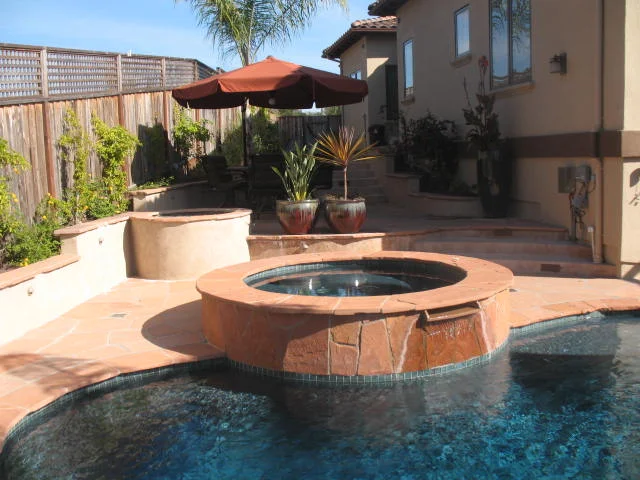 To fulfill the owner's wish list on a small and sloping site presented some design challenges to our team. The final result incorporates terraces to maximize every square foot of the back yard to include a circular fire pit, in-ground spa and natural shape swimming pool.  Both the spa and the lower wall have waterfalls that spill into the pool, using the terraces to create a design feature. The bar and cooking island are covered with a shade structure for comfort from the late afternoon sun. The pool equipment is hidden behind the bar area with access to the service driveway and media room. A tropical planting theme was used to compliment the resort feel, with privacy created using decorative fencing and large mature perimeter plants.