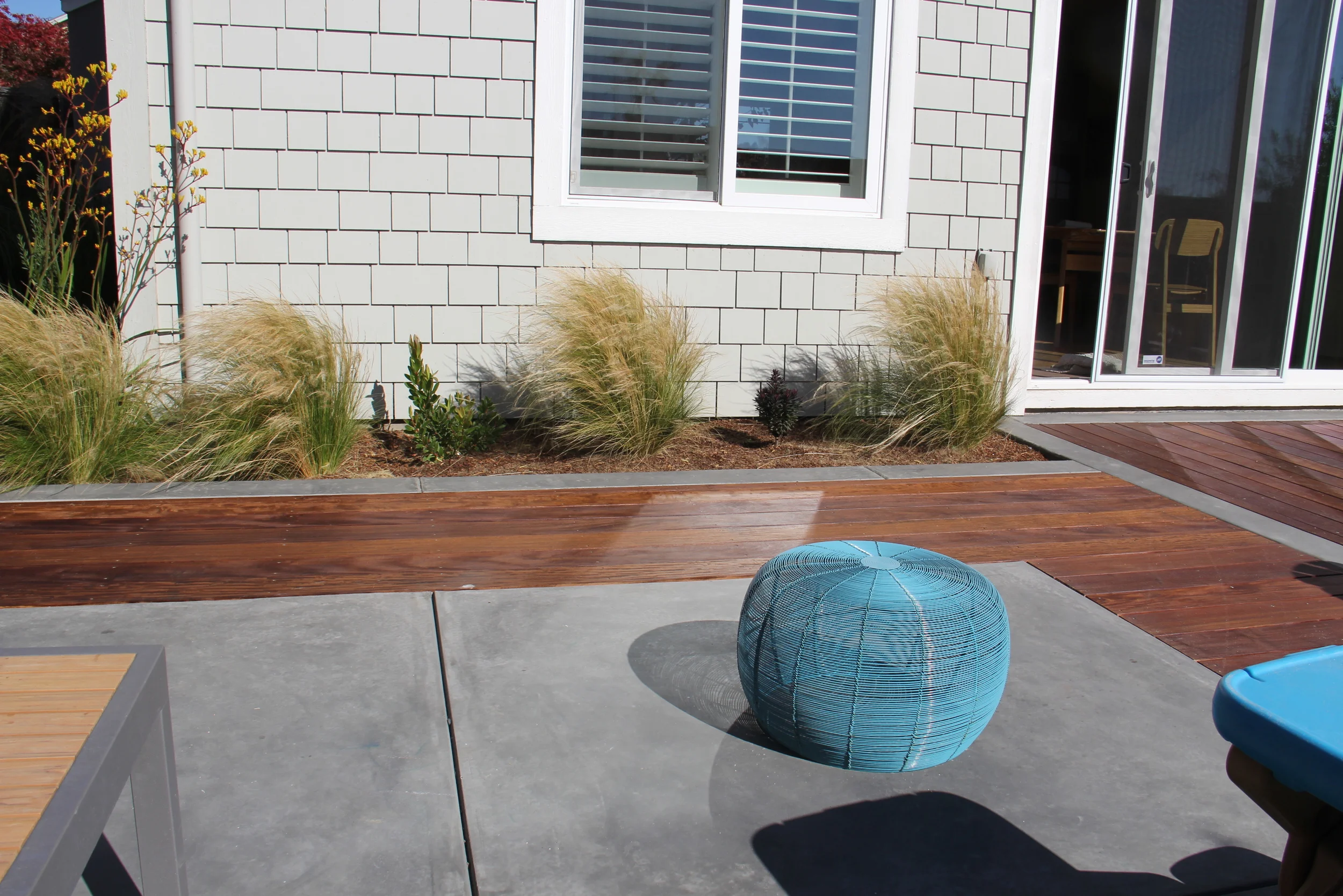 This award winning* contemporary outdoor entertaining space was designed for a family with young children. The new design reduces the amount of lawn but still provides play space for kids and an area to cook and relax. A retaining wall creates terraced rooms from the previously sloping, under-utilized lawn. The top terrace connects directly to the house and provides space for a grill, and outdoor dining area. A fountain and sandbox centered on the living room doors allow for a direct line of sight to children playing outside. As the children grow, the sandbox can be retrofitted as an outdoor fire-pit. Materials including Ipe wood decking and poured concrete walls were selected for durability and a clean modern aesthetic. The lower terrace provides a lawn, outdoor shower and drought tolerant colorful planting beds that also provide privacy from an adjacent park.