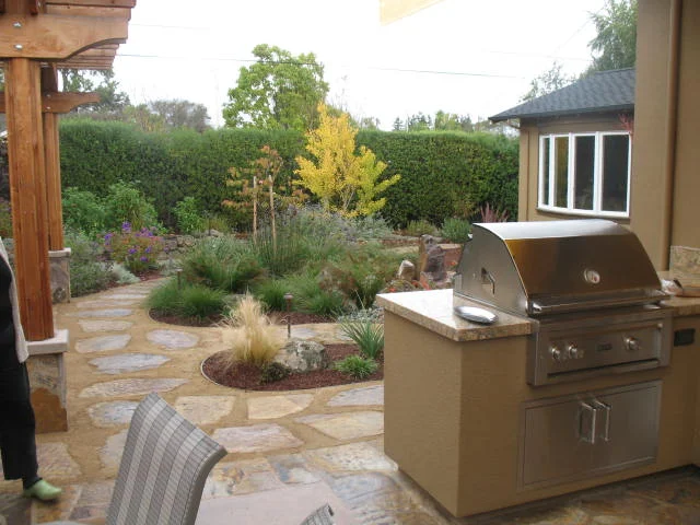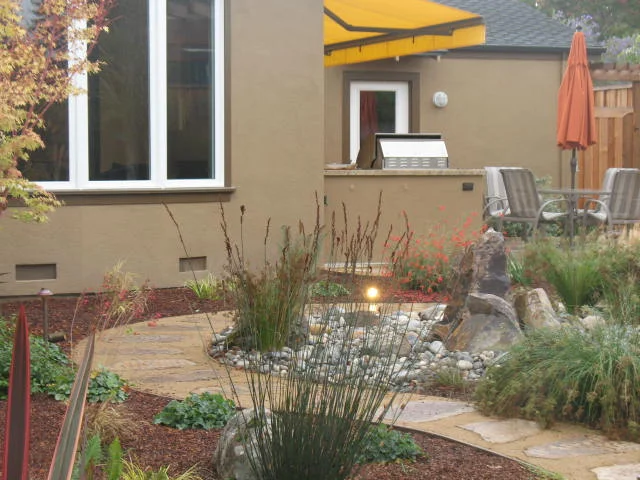 This west side backyard was mostly lawn when the owners commissioned our design team to rethink the space. The renovated garden utilizes all water conserving plants providing both privacy and year round interest. A new bioswale along the perimeter of the property catches surface water and allows it to percolate into the soil.  Amenities include a raised vegetable bed made with natural stacked stone, an arbor covered seating area, a gas fire element, a recirculating natural stone water feature and a cooking island. Curved flagstone pathways and planted berms traverse the back yard leading to a bench and secluded spa. The resulting transformation is featured in the Santa Cruz Municipal Water District’s list of water conserving/lawn free design examples.