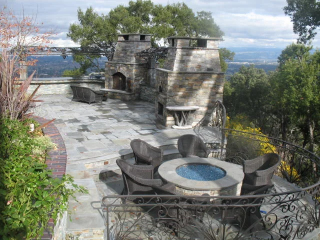 This garden, located in the hills of Saratoga, was designed to emphasize the beautiful oak woodland and panoramic valley views. The terraces provides a sequence of garden rooms to accommodate varying group sizes and uses. The main cut stone patio and outdoor kitchen offer a space to entertain, cook and enjoy the surroundings. The outdoor kitchen is anchored by a stone fireplace and pizza oven linked with a curved, black granite-covered counter. On either side of the fireplace and pizza oven are counters for food prep and cooking that include a grill, sink, refrigerator, wine cooler and kegerator. Removed from the main patio, a sunken patio with a fire table provides an intimate gathering space.