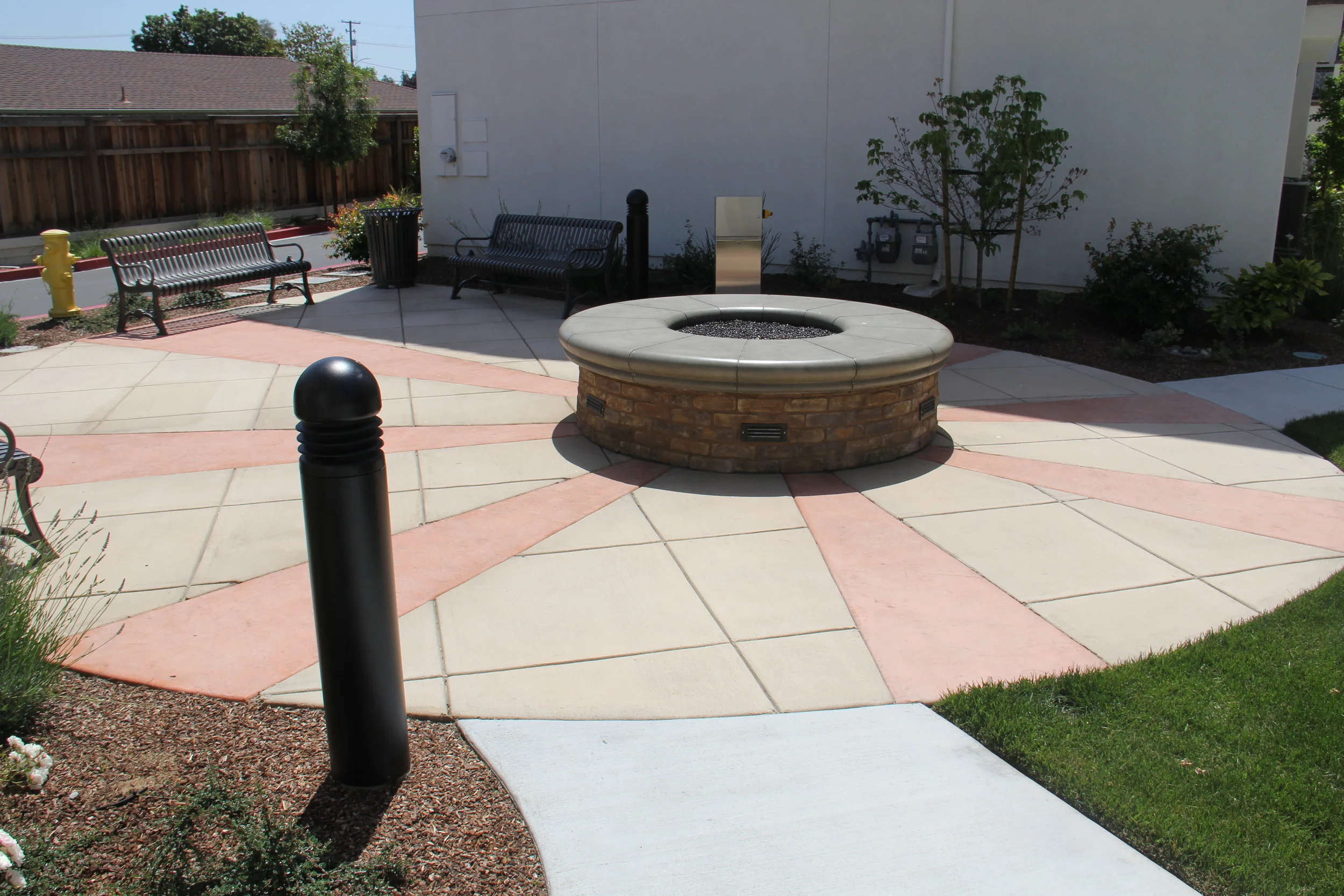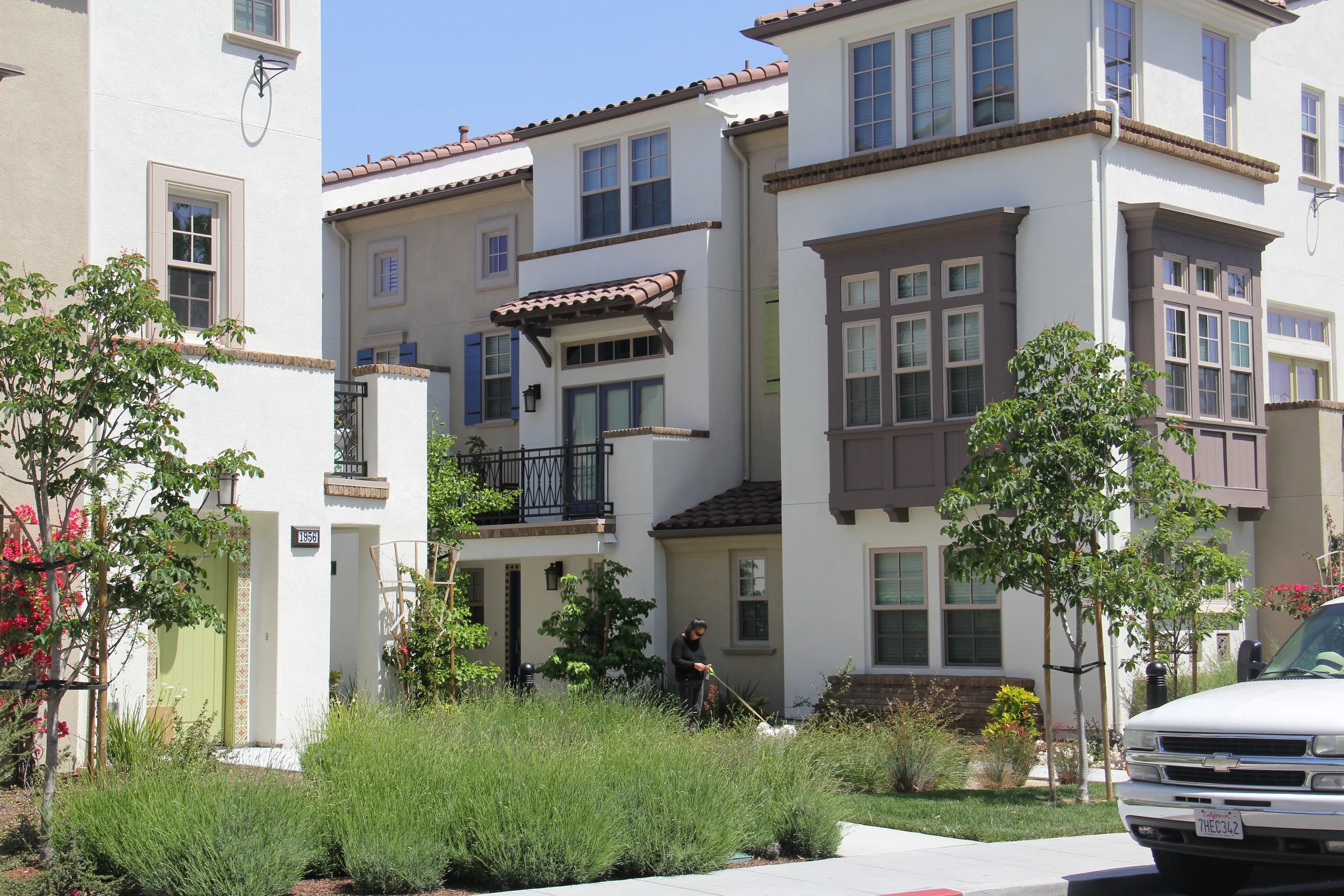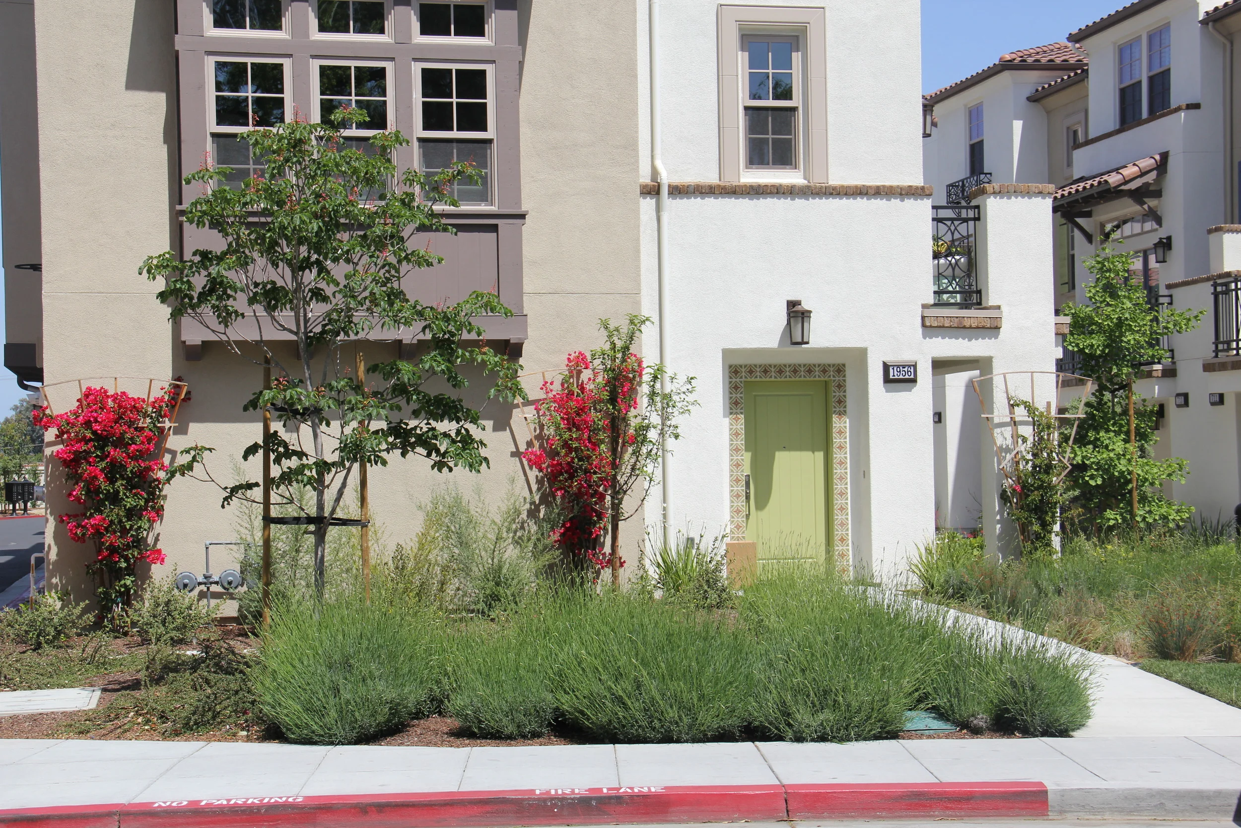 The urban lifestyle is enhanced in this newly completed development just a few blocks from the headquarters of Google. The design provides common areas for residents to mingle and enjoy a fire pit, seat walls and benches. Bio-retention areas capture all of the water runoff from the building and paving. A tree lined paseo between the townhomes creates separation and privacy. Deciduous trees have been placed along the south and west side of the development to provide summer cooling while allowing the winter sun to warm the homes. All plants are water conserving and are watered with a drip irrigation system.