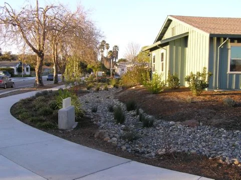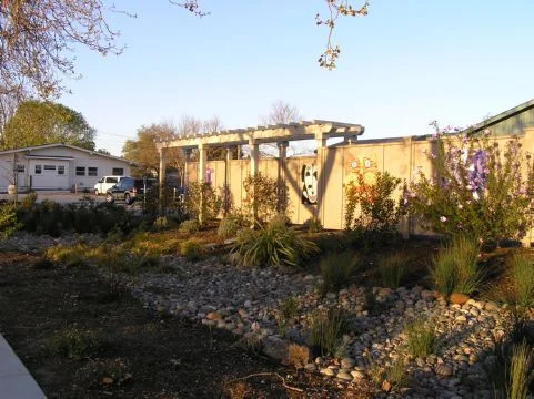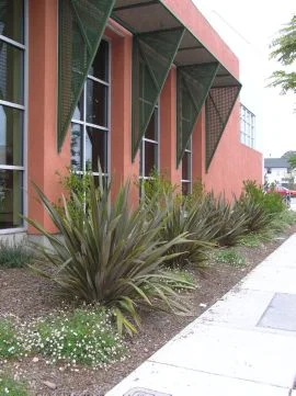 This project focuses on a water wise plant palette and bioswales with native rushes and reeds to hold and purify collected rainwater. Surface water and rain water from the building's roof are directed to the bioswales, diverting it from the storm drain system and allowing it to percolate into the soil. Drought tolerant natives and Mediterranean plants create a seasonal display of color. Colorful animal murals along the side of the building add artistic elements and help people find the building along the 7th Avenue corridor.