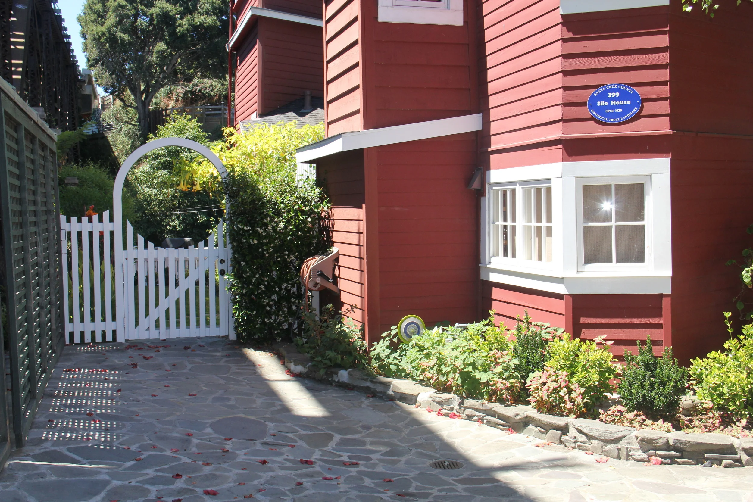 Built in 1926, the Windmill House and Silo House are landmarks along Soquel Creek in beautiful Capitola-by-the-Sea. The renovation of the landscape whimsically mirrors the eccentric nature of the original builder/owner. Tumbled flagstone used to simulate water washed stone from the river creates a walkway from the used brick patio to the new wooden deck overlooking the creek. Colorful plantings, window boxes and containers also reflect the playful theme of this river retreat. Other amenities include a spa, outdoor shower, a putting green, and a raised seat wall planter and fire pit.