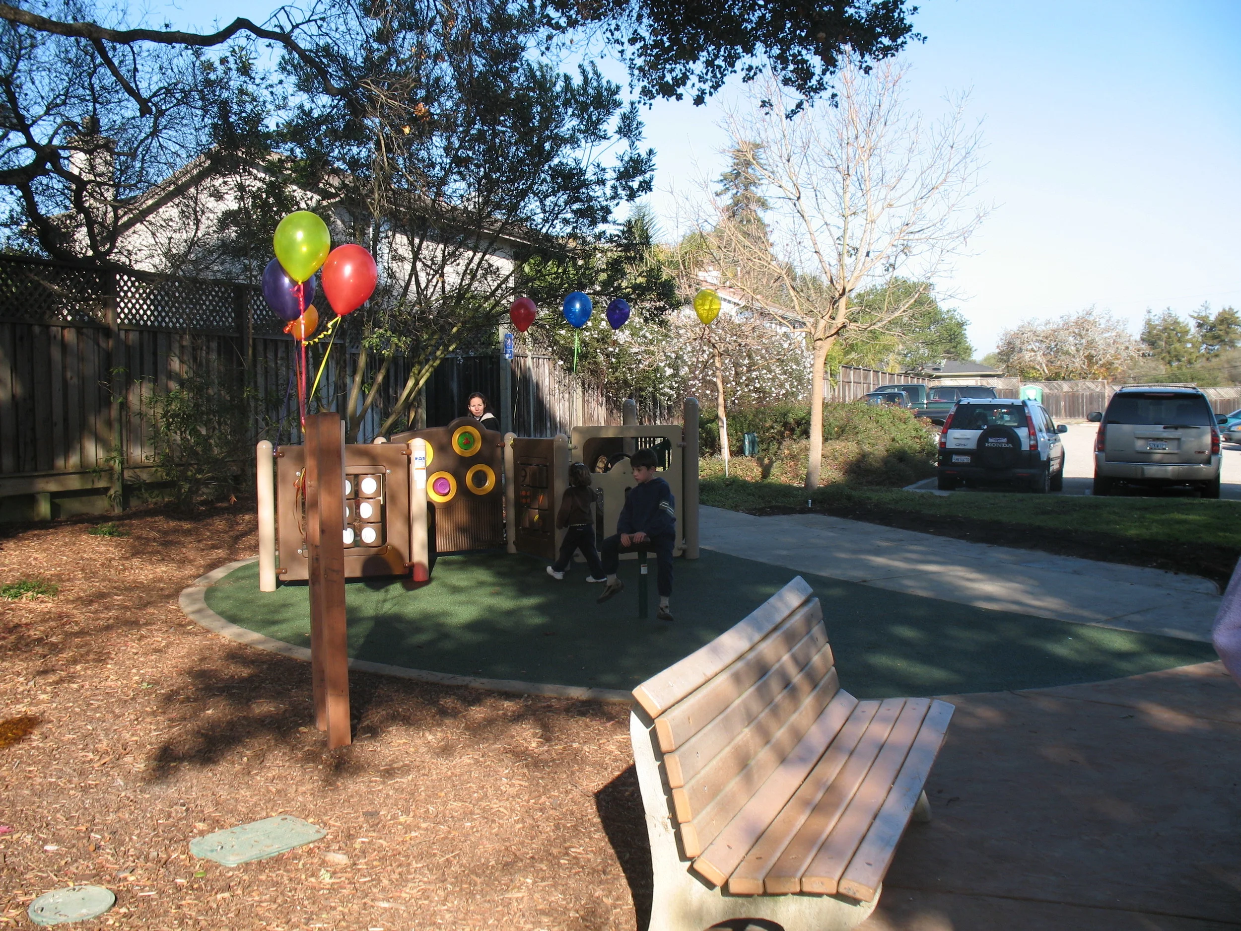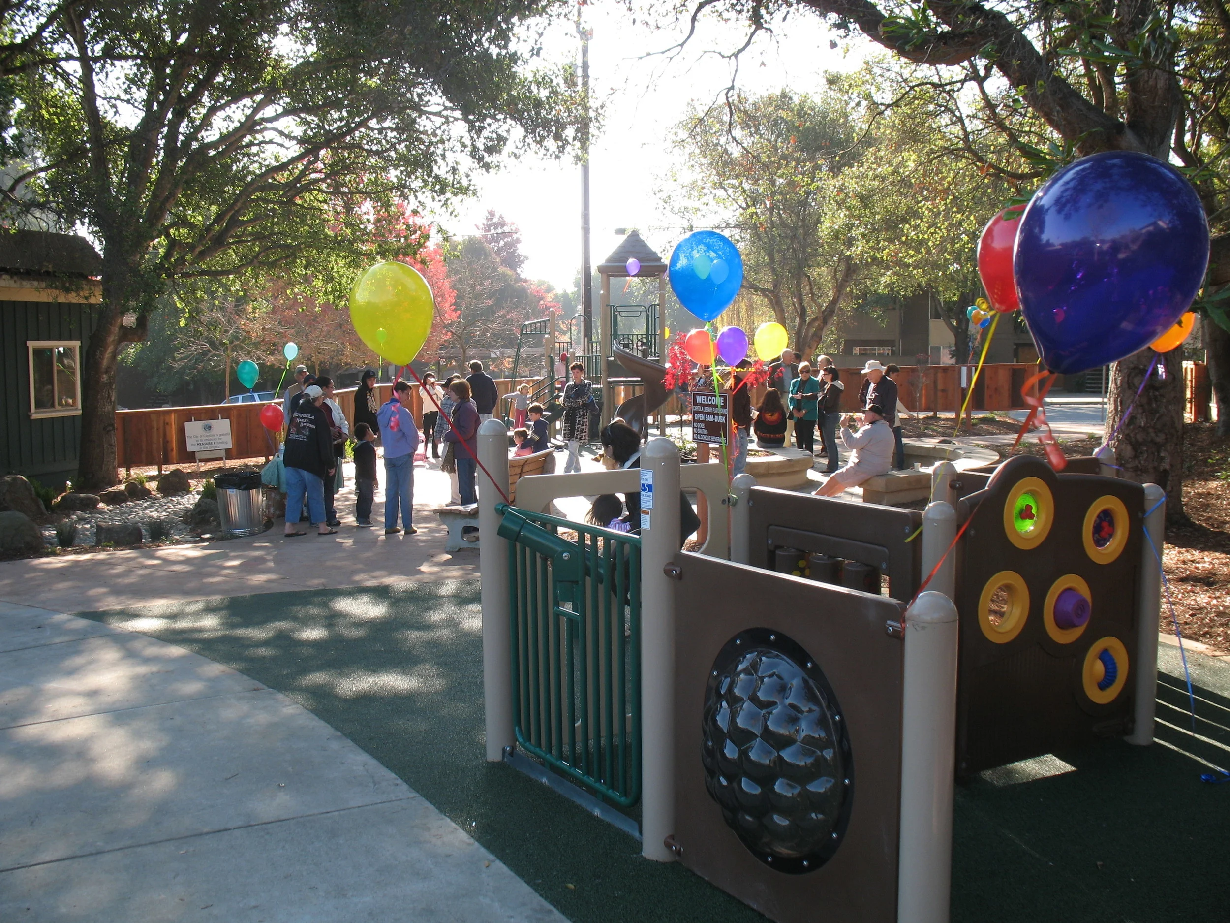 The incorporation of a park next to the existing Library in Capitola has provided the community with a safe, beautiful place for outdoor reading, socializing and playing. The stately Oak trees native to the site give the park a calming dappled shade and are the backdrop for the seating and play elements. Parents are often seen enjoying lunch or a book on the seatwall under the oak canopy, while children are actively playing on the selected play structures or imagineering with stones, leaves and sticks in the dry creek bed.